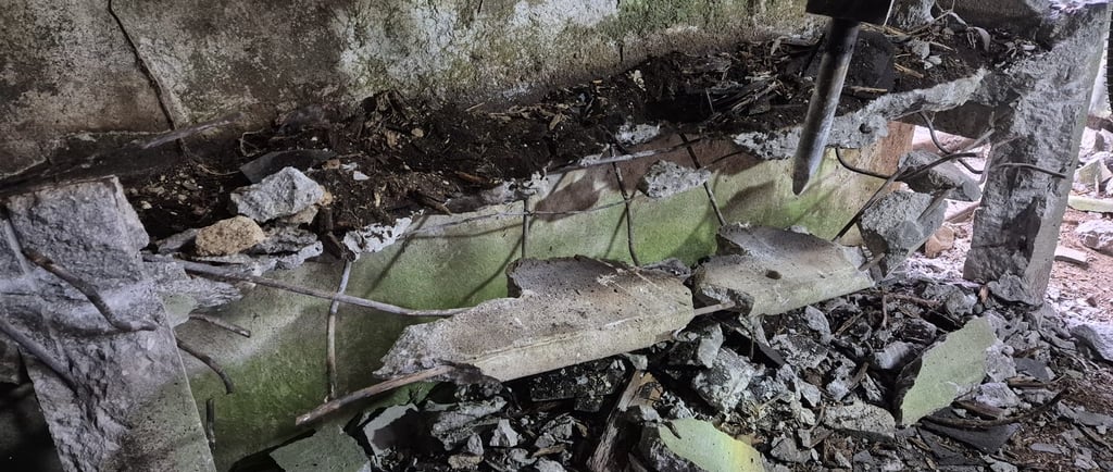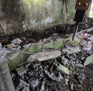 Nous avons cassé un abreuvoir en extérieur et des mangeoires en béton armé dans l'étable puis déblayé les gravas en triant les pierres